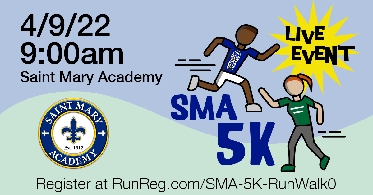 Please join us for the SMA 5k road race on Saturday, April 9 at Saint Mary Academy at 9:00am.